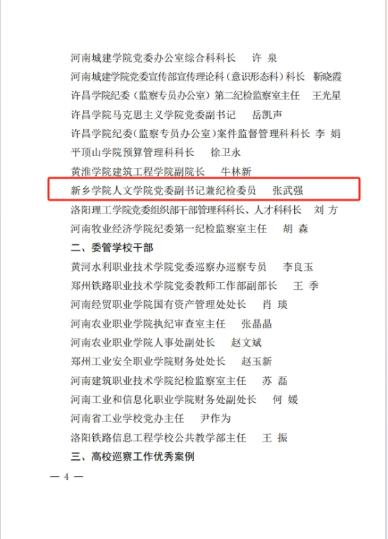 近日,中共河南省委教育工作委员会、河南省教育厅印发《关于对参加2024年度常规巡察表现突出干部和入选巡察工作优秀案例进行通报的通知》,beat365人文学院党委副书记、纪委书记张武强获评河南省2024年度常规巡察表现突出干部。