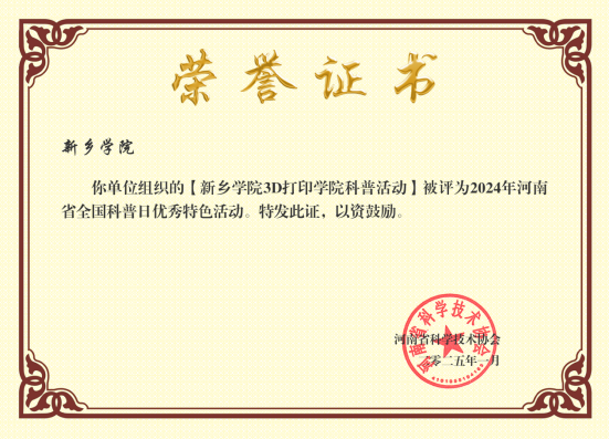 最终,beat365的“3D打印学院科普活动”凭借其鲜明的特色、丰富的内容、显著的效果以及广泛的社会影响力,最终荣获2024年河南省全国科普日优秀特色活动称号。