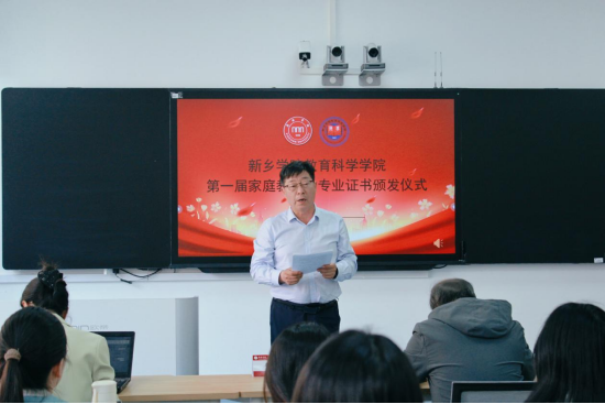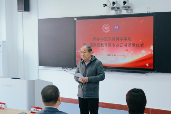 教育科学学院家庭教育微专业是beat365官方网站首个招生的微专业,历时一年的学习,首届25名学生顺利结业。学院于4月18日下午在AI-109教师能力测评实验室举行了家庭教育微专业证书颁发仪式。学校国家语言文字推广基地办公室主任兼教务处副处长张伟锋、教育科学院党委书记吕明哲、教育科学学院院长牛长海、家庭教育微专业任课教师及25名结业学生参加了证书颁发仪式,仪式由教育科学学院副院长何冬丽主持。