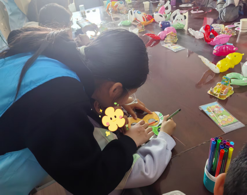 在手工制作环节,志愿者一对一指导孩子们进行立体拼图。一块块拼图在小手中逐渐变成了一座座各式各样的立体房子。看着自己亲手完成的作品,孩子们的脸上洋溢着自豪和喜悦的笑容。这些小小的房子,不仅是孩子们动手能力的见证,更是他们心中梦想家园的雏形。“彩虹刮刮画”活动则为孩子们打开了一扇五彩斑斓的艺术之门。孩子们用刮笔在黑色的画纸上轻轻刮擦,一幅幅五彩缤纷的世界逐渐显现。最后,志愿者们协助孩子们用水彩笔绘制动物面具。孩子们发挥着自己的创意,用鲜艳的色彩勾勒出可爱的动物形象,戴上面具后,仿佛变成了一个个活泼的小精灵。