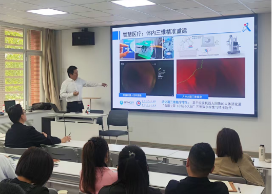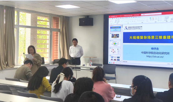 申抒含研究员首先介绍了大规模复杂场景三维重建的关键问题,包括三维几何重建、三维语义理解、三维结构表达等,是数字城市、无人系统、工业孪生等领域的共性需求。其中计算机视觉、摄影测量、机器人等多个领域的研究不断交叉融合,几何视觉方法与深度学习方法也在不断发生碰撞。随后全面介绍了其研究团队在大规模复杂场景三维重建与理解方面的最新研究进展,以及在智慧城市、机器人导航、智能制造等领域的实际应用。最后,申抒含研究员与现场师生进行了互动交流。