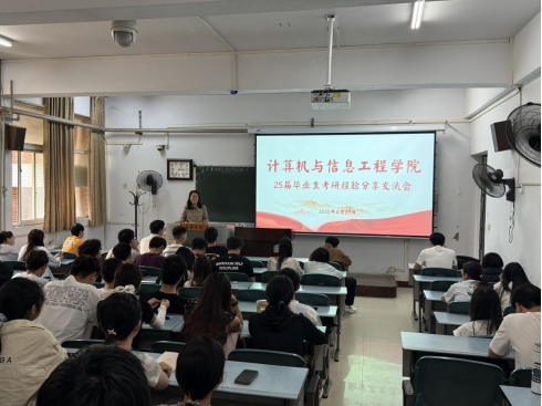 4月29日下午,计算机与信息工程学院在A14-128教室,成功举办了2025届毕业生考研经验分享交流会。此次活动吸引了各年级学生踊跃参加,现场座无虚席。