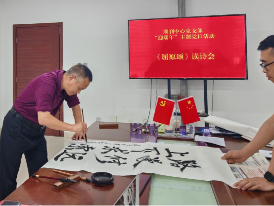 活动伊始,屈金星以《屈原颂》为主线,结合自己诗歌、辞赋的文学创作和策划,以文明的视角、诗学的审美,穿透古今中西,解读屈原精神,弘扬传统文化。他指出,屈原是中国第一位爱国主义诗人,被尊为中国诗歌之祖、中国辞赋之祖、“中国文学家的老祖宗(梁启超语)”、世界四大文化名人之一。他认为,荷马、屈原是人类诗歌的双子星座;孔子、屈原是中国文化的双子星座。屈原诗作的浪漫主义诗歌传统对中国文学的发展产生了重要影响,其中表现的爱国精神、求索精神、民本思想开启了中国诗歌的先河。另外,屈原诗作蕴含非凡的宇宙视野和深刻的哲理思考,这在人类诗人中是极其罕见的。屈原还是一位“百科全书式”的人物,在众多领域都有卓越成就,他的爱国忧民精神、改革创新精神、正直清廉精神、自由民主精神等更是成为中国精神的重要组成部分。作为中华民族四大传统节日之一的端午节主要是为了纪念屈原。端午节的标志性活动赛龙舟,不仅体现了端午节蕴含的深厚文化底蕴,同时也是中华民族开拓进取精神的现代体现。活动最后,由屈金星领诵,在场的全体老师集体共诵《屈原颂》。诵读结束后,屈金星现场挥毫泼墨,化用《离骚》中的经典名句“路漫修远,上下求索”为期刊中心题字留念。
