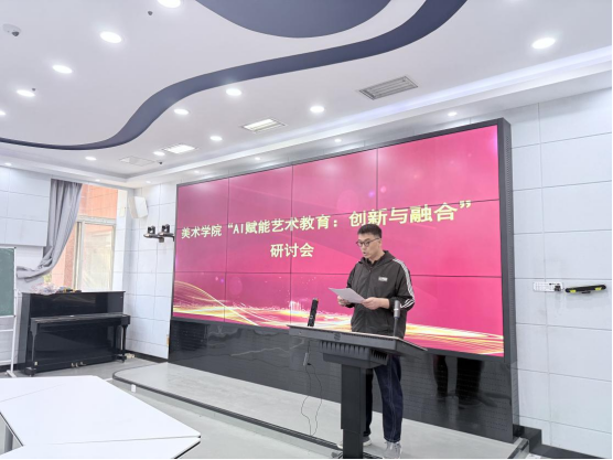 5月23日上午,美术学院在A05楼104智慧教室召开“AI 赋能艺术教育:创新与融合”研讨会。会议由教科研秘书郭颖主持,美术学院党委书记李秀霞、院长耿聪、副院长毛璞、动画教研室主任时溪蔓、视觉传达设计教研室主任王鹏、基础教研室主任胡晓瑛以及各专业教师代表参会,共同探讨人工智能与艺术教育的融合发展路径。