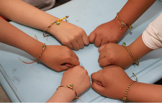 在编织实践环节,志愿者们变身“手工导师”,以“理论+实操”的方式耐心示范,手把手教孩子们绕线、打结,传授编织五彩绳的技巧。孩子们手中五彩丝线上下翻飞,时而皱眉思索、时而欢呼雀跃。遇到困难时,大家互帮互助,现场气氛热烈而温馨。随着一根根色彩斑斓的丝线在指尖穿梭、交织,精美的五彩绳逐渐成型。孩子们自豪地展示自己亲手制作手链,个个脸上洋溢着欢笑。