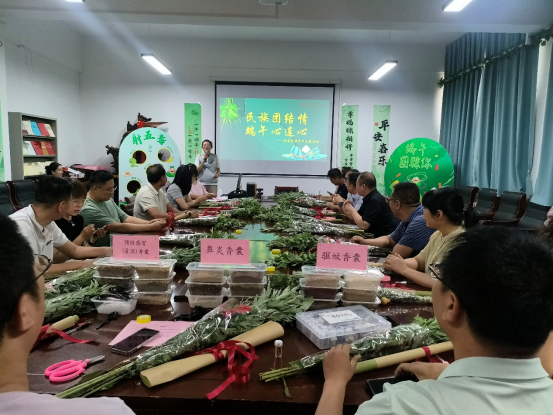 “艾香盈袖”民俗体验活动中,在民俗知识有奖竞答环节,通过让教职工抽取民俗知识相关题目,考验教职工对端午节及中华优秀传统文化的了解,寓教于乐;通过专业花艺制作者的讲解和演示,教职工亲自制作了象征驱邪避秽的香草花束;在非遗香囊制作环节,各类中草药有序摆放,清香弥漫,教职工制作出了一个个寄托幸福安康祝福的香囊。