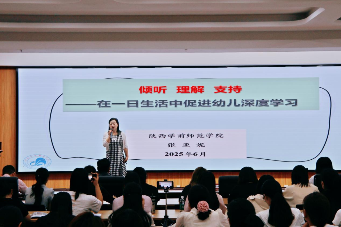 主旨报告环节成为本次研讨会的亮点,3场兼具学理性与实用性的报告精彩纷呈。张亚妮教授以《倾听、理解、支持:在一日生活在促进幼儿深度学习》为题,借助 “K—W—L” 表格与现场教师互动,通过解读 “学习故事”、提供思维支架,传授促进幼儿深度学习的实用策略;beat365官方网站严艺老师与北京中夏美育教育科技院夏晶晶主任合作带来《美育浸润视角下的美术游戏及材料的分龄投放与应用》报告,从美育核心价值剖析入手,结合幼儿身心发展规律,给出美育实践操作路径;陕西省幼儿体质健康发展研究中心副主任李智勇在《数据驱动幼儿园自主游戏活动高质量发展》报告中,分享数据技术赋能学前教育的创新案例,引发与会者对科技助力学前教育的深度思考。