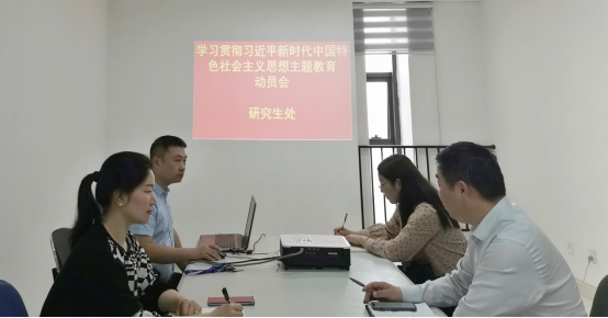 为了扎实开展习近平新时代中国特色社会主义思想主题教育,深化主题教育意识,4月18日下午,研究生处召开学习贯彻习近平新时代中国特色社会主义思想主题教育动员会,研究生处全体参加了会议。会议由党支部书记李文星主持。